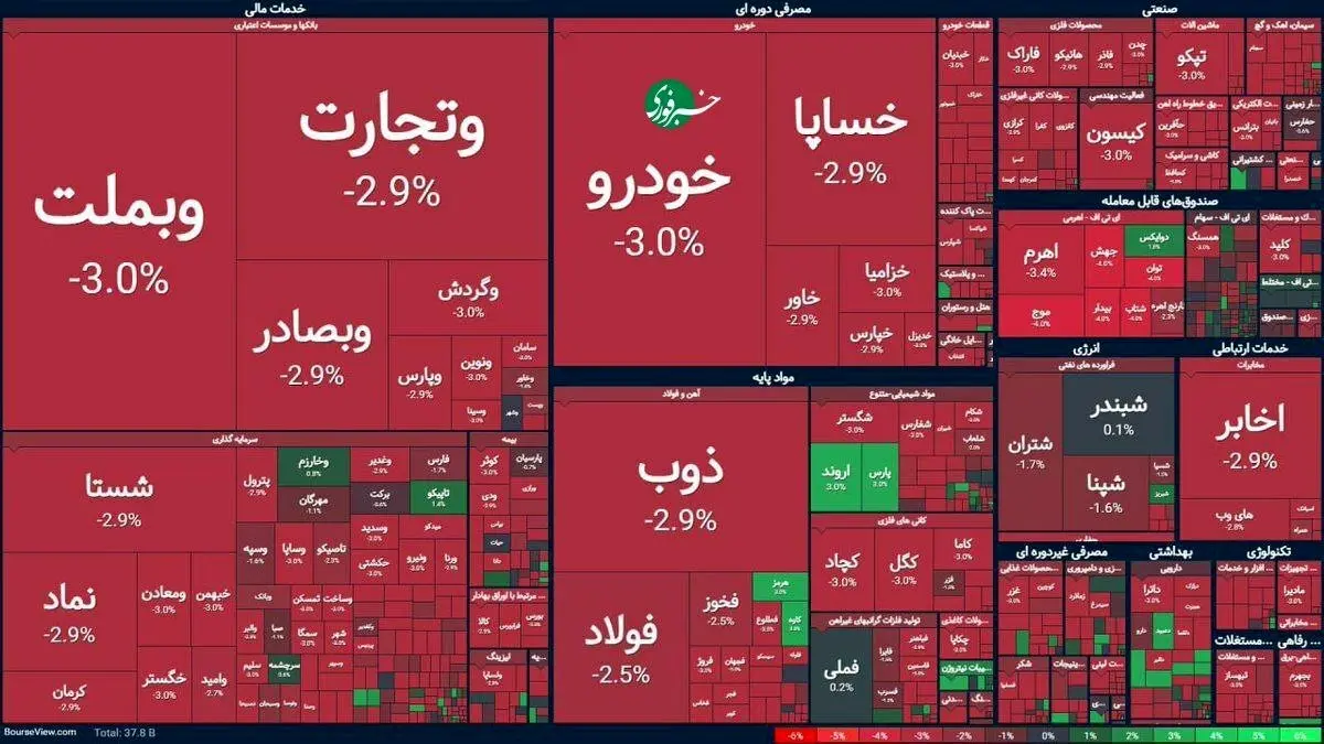 بازار سرمایه امروز بعد از چند روز تعطیلی یکی از منفیترین روزهای خود را پشت سر گذاشت. نقشه بازار نشان میدهد بیشتر نمادها در صف فروش و محدوده منفی کامل معامله شدند.